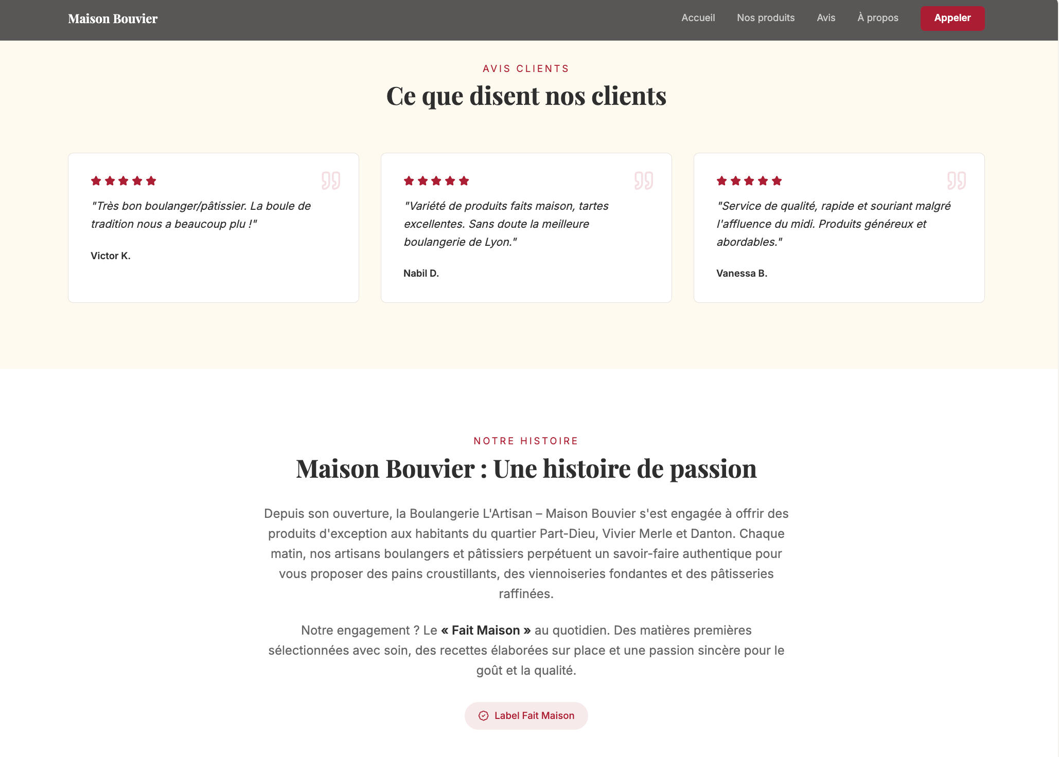 Le système a intégré sur la page des avis clients issus de la fiche Google Maps. Elle a aussi formulée une histoire pour cette boulangerie.