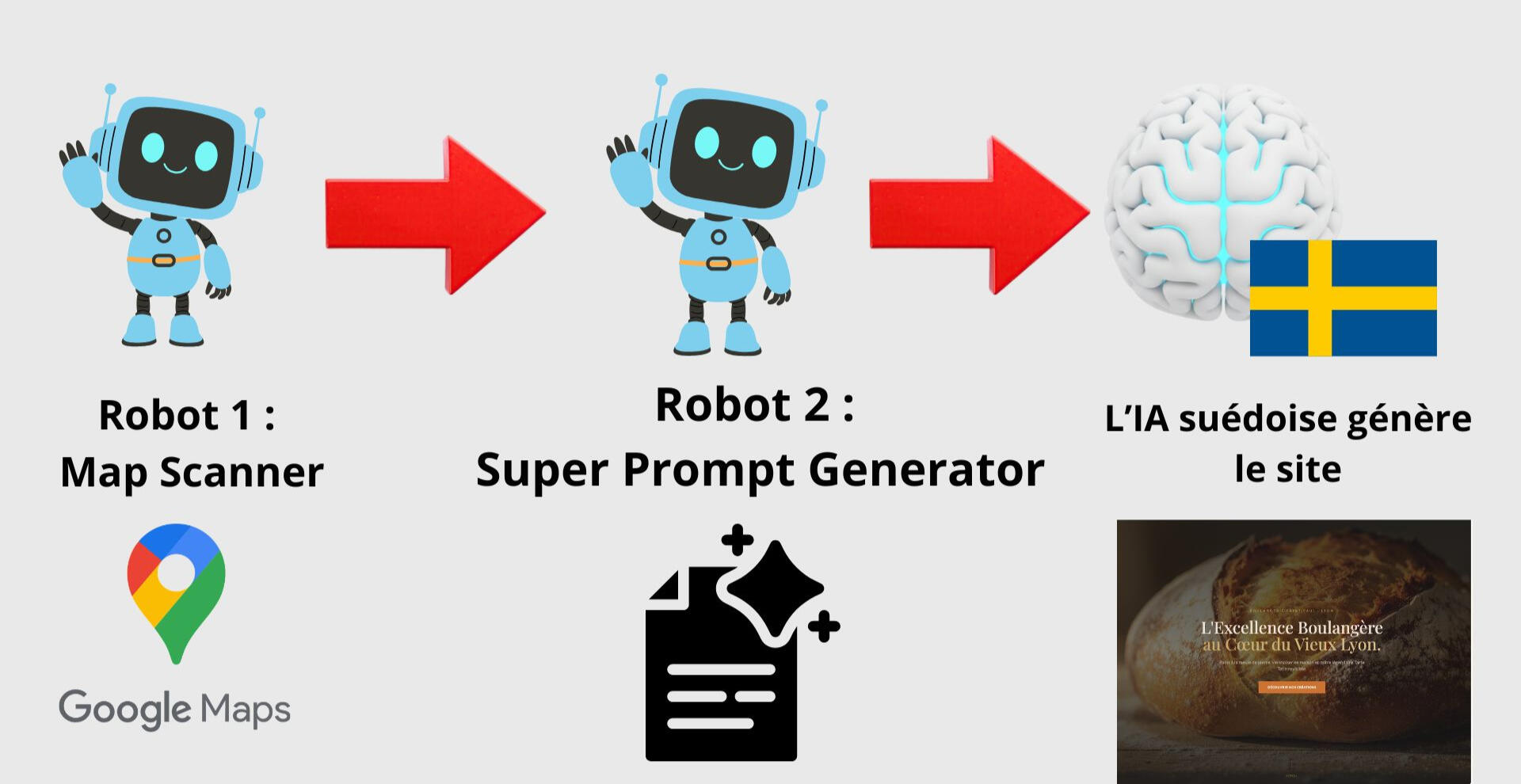 Ensuite, je donne le résultat de cette analyse au deuxième robot, appelé "Super prompt Generator".Ce robot va créer un prompt spécial, hyper-détaillé qui décrit exactement le site qu'on souhaite obtenir.La création : Je colle ce super-prompt dans une IA suédoise de pointe.Sous vos yeux, le site se construit tout seul : les textes parlent de ses clients, les couleurs sont professionnelles, et la structure est digne d'une agence haut de gamme.L'IA a créé pour nous les menus ainsi que le texte 100% customisé pour cette boulangerie.Nous pouvons vendre ce site à l'entreprise.